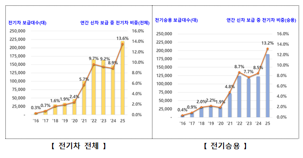 국내 전기차 시장은 2023~2024년 수요정체(캐즘) 시기를 지나 2025년 국내 연간 최고 보급대수(약 22만대)를 달성하는 등 보급이 확대되는 추세다. 이는 그간 다양한 전기차 제품군을 구축한 기업의 노력과 정부의 적극적인 정책 및 재정적 지원에 힘입은 것으로 판단된다.