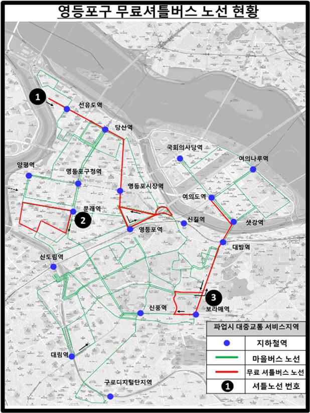 임시 운행 노선은 ▲1번 노선, 선유도역~당산역~영등포시장역~영등포역 ▲2번 노선, 문래역~국화아파트~문래중학교(문래동 순환) ▲3번 노선, 보라매역~공군호텔~샛강역~여의도역이다. 노선별 각 2~3대의 차량이 배치돼 순환 운행될 예정이다. 각 셔틀버스에는 구청 직원이 탑승해 구민의 안전한 승‧하차를 지원하고, 운행 노선과 정류장 안내를 맡는다.