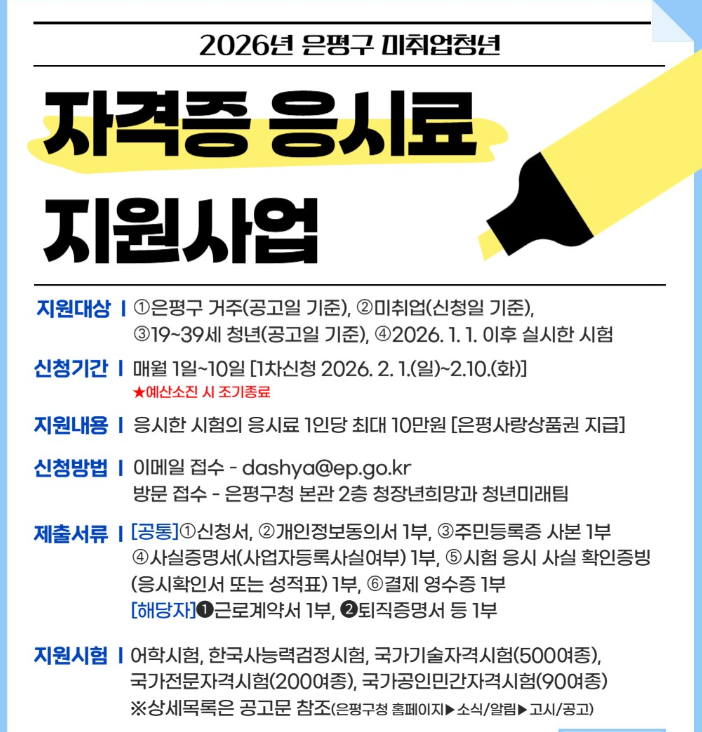 본 사업은 지난 2024년부터 추진해 온 정책으로 자격증 시험 응시료를 1인당 최대 10만 원까지 은평사랑상품권으로 지원하는 내용이다. 합격 여부와 관계없이 해당연도에 실제 응시한 시험이면 신청할 수 있다.