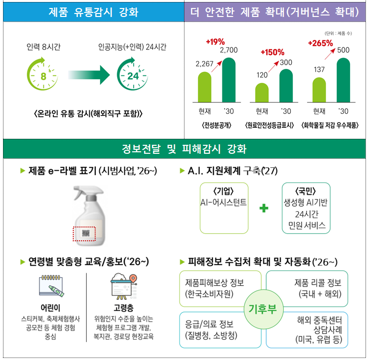 유통량이 지속 증가하는 온라인 및 해외직구 유통망 내 불법·위해제품을 빈틈없이 신속하게 차단하기 위해, 인공지능을 활용한 24시간 온라인 유통 감시체계를 구축하고, 온라인유통사의 적법제품 확인‧고지 의무( 판매자가 제품 등록시 주요정보를 입력하게 하고, 소비자가 확인할 수 있도록 조치)를 강화한다.