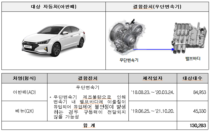 현대자동차 아반떼 등 2개 차종 130,283대는 무단변속기 부품 내부로 이물질이 유입되어 구동력이 전달되지 않을 가능성으로 1월 19일부터 시정조치를 진행한다.