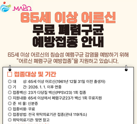 박강수 마포구청장은 “폐렴구균 감염은 면역력이 저하된 고령층에서 중증으로 이어지기 쉬운 만큼 65세 이상 어르신에게 예방접종이 꼭 필요하다”라며, “대상 어르신들께서는 가까운 의료기관을 통해 무료 접종을 받으시고 건강한 일상을 이어가시길 바란다”라고 말했다.