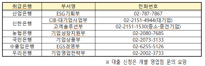 녹색정책금융 활성화 사업은 6개 금융기관(산업·신한·농협·국민·수출입·우리은행)과 함께 운영된다. 대출상품 관련 문의는 올해 1월 말부터 참여 금융기관 영업점에서 가능하다.