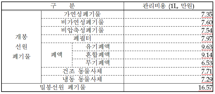 중저준위 방사성폐기물 관리비용은 경주 중저준위 처분시설 건설·운영 등 미래에 소요될 사업비와 제11차 전력수급기본계획에 따른 방사성폐기물 발생량 전망 등을 반영하는 한편, 이번 ‘방사성폐기물 관리법’ 시행령 개정을 통해 미래에 소요될 사업비를 현재가치로 환산하여 관리비용을 산정토록 제도를 개선함으로써 비용 부담의 합리성과 제도 운영의 예측 가능성을 높였다.