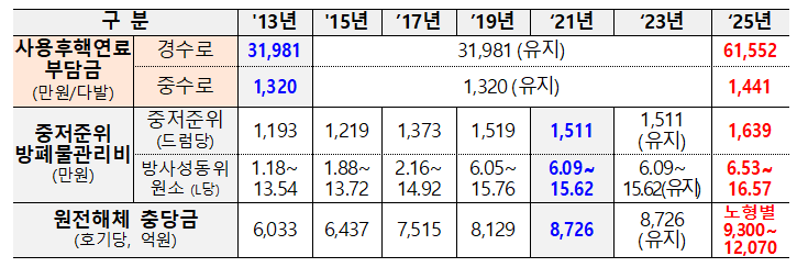 이번 개정에 따라 2013년 이후 동결되어 온 사용후핵연료 관리부담금은 경수로 92.5%, 중수로 9.2% 인상되고, 중저준위 방사성폐기물 관리비용은 2021년 대비 8.5% 인상된다. 이러한 원전사후처리비용 인상으로 한국수력원자력은 연간 약 3,000억 원(약 0.8→1.1조 원)을 추가로 부담하게 되고 원전 발전원가는 2~3원/kWh 수준 상승할 것으로 전망된다.