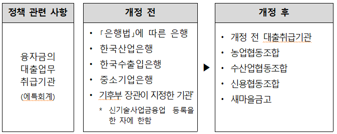 이번 개정안은 재생에너지 정책융자 취급기관(현재 15개 기관)에 지역과 밀접한 4개 금융기관(농업협동조합, 수산업협동조합, 신용협동조합, 새마을금고 )추가를 주요 내용으로 하고 있다.