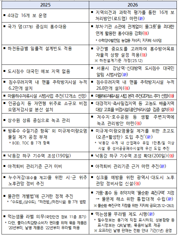 기후에너지환경부는 그간의 성과를 확산하고, 각 분야에서 실효성 있는 물 관리 업무를 본격 추진하기 위해 2026년 주요업무 추진계획을 마련했다. 특히, △안심하고 누릴 수 있는 물 환경 조성, △빈틈없는 이·치수 관리체계 수립, △지속가능한 물 관리 역량 강화, △탄소감축형 물 관리 체계 전환 이라는 4가지 핵심과제 아래 다음과 같이 세부 이행방안을 수립했다.