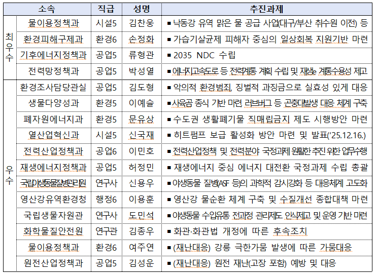 최우수 직원 4명은 △물이용정책과 김찬웅 사무관(낙동강 유역 맑은 물 공급 사업), △환경피해구제과 손정화 주무관(가습기살균제 피해자 중심의 일상회복 지원기반 마련) △기후에너지정책과 류형관 사무관(2035 국가 온실가스 감축목표 수립 지원), △전력망정책과 박성열 사무관(에너지고속도로 등 전력계통 계획 수립 및 재생에너지 계통수용성 제고)로 선정됐다.