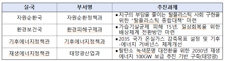 우수부서는 △자원순환정책과(탈플라스틱 사회 기반 마련), △환경피해구제과(가습기살균제 피해자 일상회복 지원), △기후에너지정책과(2035 국가 온실가스 감축목표 설정), △태양광산업과(2030년 재생에너지 100GW 보급기반 구축) 등 4개 부서다.