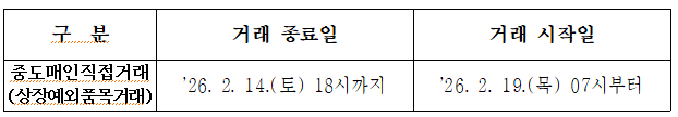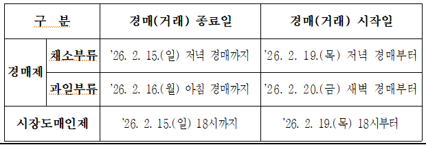 시장도매인제의 경우 ’26. 2. 15.(일) 18시까지 진행하고, ’26. 2. 19.(목) 18시부터 다시 거래가 진행된다. 양곡도매시장은 ’26. 2. 14.(토) 18시까지 거래가 이뤄지고 ’26. 2. 19.(목) 07시부터 거래를 재개할 예정이다.
