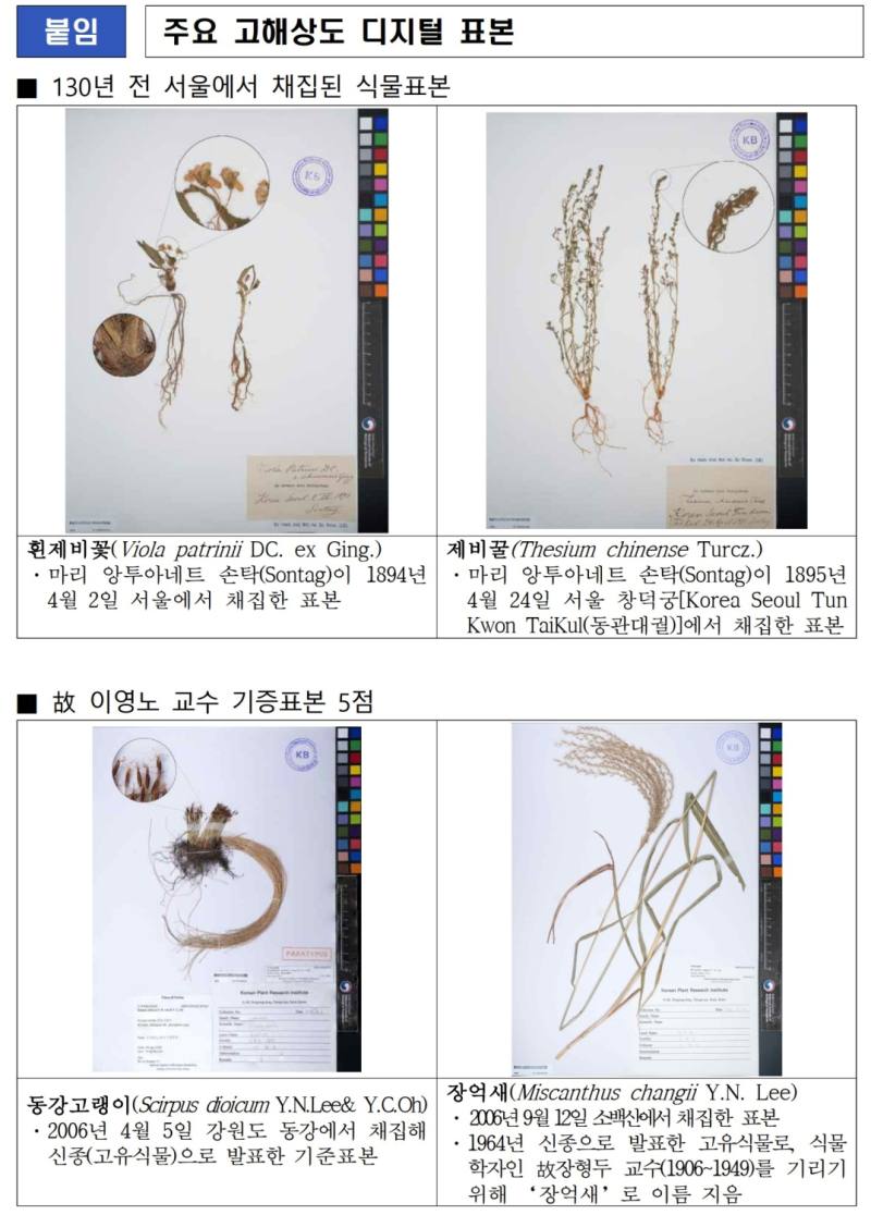 최근 국립생물자원관 측이 디지털 사진 자료로 전환한 130년 전 식물표본과 고(故) 이영노 이화여대 교수가 채집한 식물표본을 공개해 화제를 모으고 있다. 국립생물자원관 측은 앞으로도 국민들이 자유롭게 열람할 수 있는 것은 물론 AI 등 디지털을 기반으로 한 생물다양성 연구 활용성 강화를 위한 생물표본의 디지털 전환에 더욱 속도를 올릴 계획이라고 전했다.