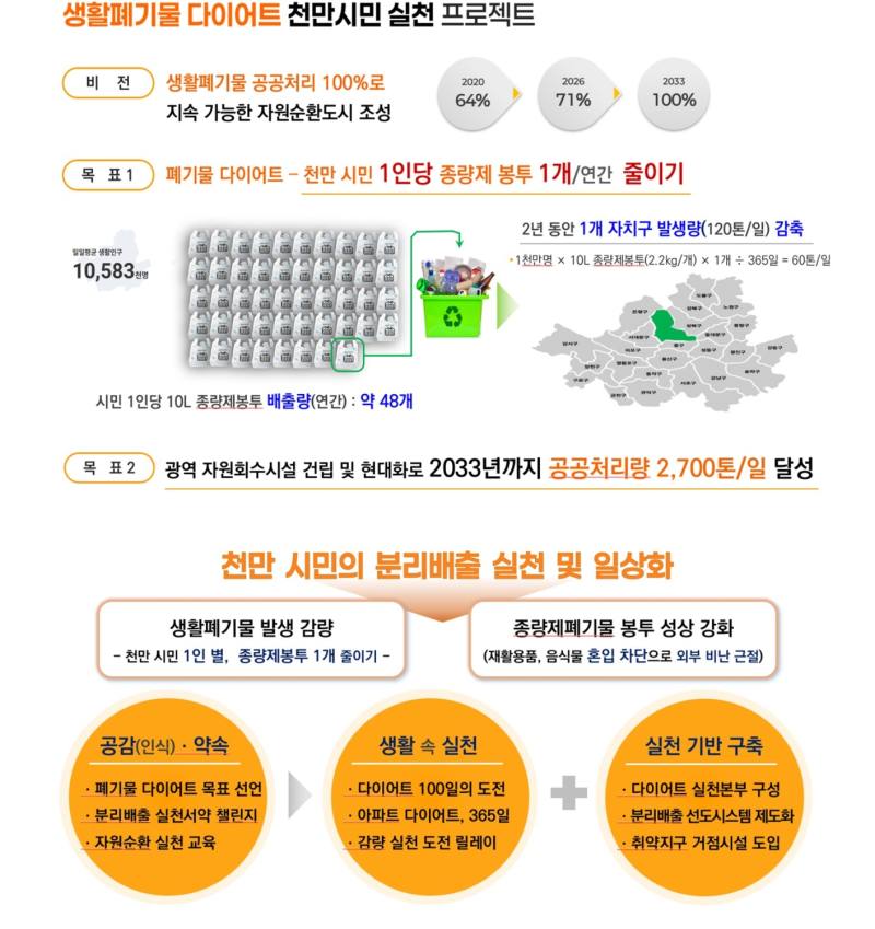 그렇다면 서울시는 어떻게 생활폐기물을 줄이려고 하는 것일까? 이는 ‘생활폐기물 다이어트 천만 시민 실천 프로젝트’를 통해서 실행될 예정이다. 서울시 측은 이달부터 이러한 프로젝트 추진에 돌입, 시민 참여를 기반으로 종량제 폐기물 발생을 줄이면서 제도와 인프라 개선을 병행, 2033년 생활폐기물 공공처리 100% 기반 마련 목표를 추진한다고 전했다.