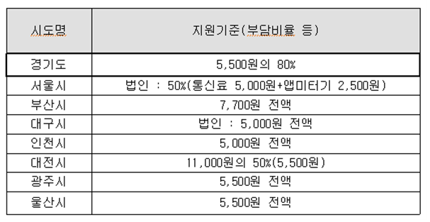 경기도는 31개 시·군 개인·법인택시 전체 택시를 지원대상으로 하며, 카드단말기 1대당 통신료 ‘5,500원/월’의 ‘80%’를 지원하고 있다.