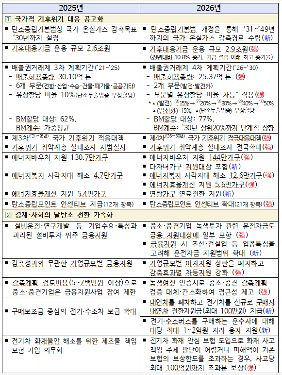 기후에너지정책실은 2026년 업무 추진방향을 △탄소중립 국가 시스템 완성, △경제·사회의 녹색 대전환과 성장동력화, △국민과 함께하는 기후위기 대응 등 세 가지 축으로 설정하고, 분야별로 핵심 과제를 추진할 예정이다.