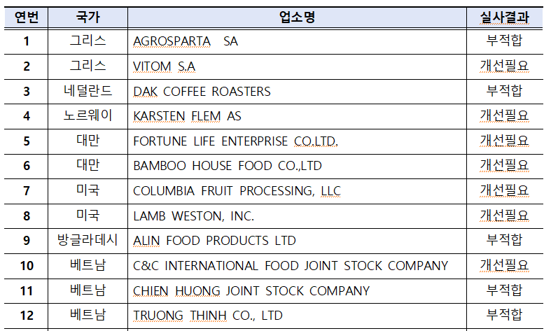 이외에 현지실사를 거부한 해외제조업소 3개소에 대해서는 수입중단 조치하여 현재 해당업소에서 제조한 식품은 수입되지 않고 있다.