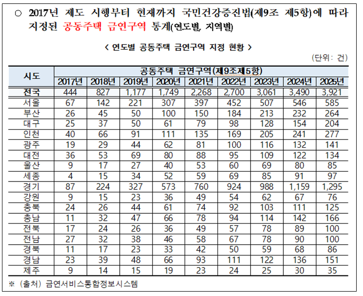 한국건강증진개발원이 김예지 의원실에 제출한 자료에 따르면, 제도가 시행된 2017년 이후 전국의 공동주택 금연구역은 해마다 증가해 2017년 444건에서 2025년 3,921건으로 9년간 약 9배 늘었다. 그러나 이러한 노력에도 불구하고 간접흡연 관련 민원 역시 매년 증가하고 있다.