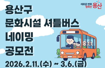 서울 용산구(구청장 박희영)가 3월 6일까지 ‘용산구 문화시설 셔틀버스’ 명칭 공모를 실시한다. 단순한 교통수단을 넘어 문화 매개체로 기능할 수 있도록, 주민 공감을 일으키고 친근한 인상의 이름을 붙이려는 취지에서다.