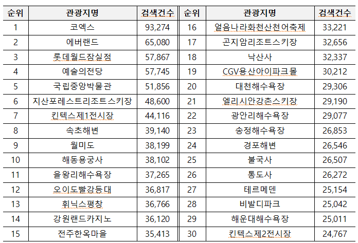 전국적으로 가장 많이 검색된 상위 관광지 15곳은 코엑스(서울), 에버랜드(서울), 롯데월드 잠실점(서울), 예술의전당(서울), 국립중앙박물관(서울), 지산포레스트리조트(경기), 킨텍스(경기), 속초해변(강원), 월미도(인천), 해동용궁사(부산), 을왕리해수욕장(인천), 오이도 빨강등대(경기), 휘닉스 평창(강원), 강원랜드(강원), 전주한옥마을(전북) 순이었다. 세계문화유산인 불국사(경북)는 25위를 기록했으며, 대구는 EXCO서관, 수성목, 이월드가 지역내 인기 관광지로 꼽혔지만 전국 30위에는 포함되지 못했다.