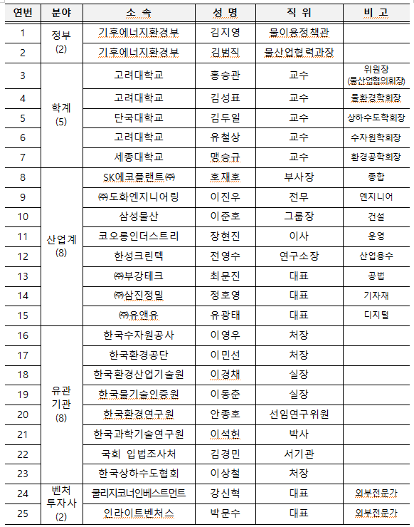 이번 행사는 기후에너지환경부, 학계, 산업계, 유관기관, 벤처투자사 등 20여 명의 전문가들이 참여하여 기후테크 물분야 국내외 동향과 기후위기 대응을 위한 물산업의 역할을 주제로 토론을 펼친다. 아울러 기후위기 대응이라는 시대적 과제 속에서 물산업의 미래 전략을 모색한다.