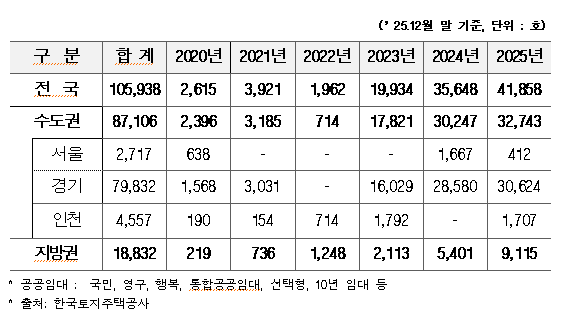 ▲LH 건설형 공공임대주택 승인 후 미착공 지역별 현황 (‘20∼25년)