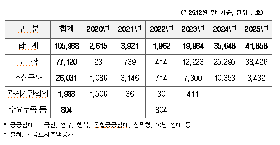 지난해 토지보상급 집행 규모도 5년 전인 비교해 절반으로 감소했다. 2020년 LH 토지보상금 집행액은 8조 4,470억원이었으나, 지난해인 2025년 토지보상금 집행액은 4조 220억원에 불과했다.