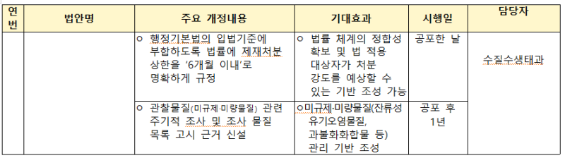 하천, 호소에서 수질과 수생태계에 영향을 줄 우려가 있는 새로운 물질을 관찰물질로 지정하여 주기적으로 조사토록 하는 한편,낚시금지·제한구역 지정 이후, 정기적으로 지정 여부를 재검토하고 필요할 경우 금지·제한구역을 변경‧해제 할 수 있도록 하는 근거를 마련했다.