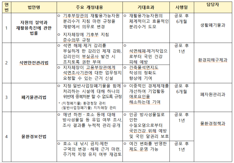 기후에너지환경부는 이날 국회를 통과한 4개 법률안이 정책 현장에서 차질없이 시행될 수 있도록 하위법령 정비 등 제반 여건 준비에 최선을 다할 예정이다.