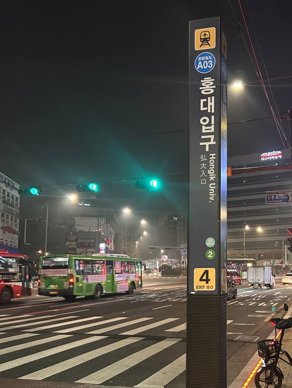 한국어 ‘ 홍대입구역’, 일본어 ‘弘大入口’인데 영어로는 ‘Hongik Univ.(홍익대학교)’이다.