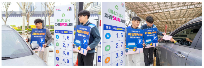 공단은 중동전쟁 장기화에 따른 자원안보위기 경계단계 발령에 발맞춰 공영주차장 승용차 5부제 시행과 연계한 현장 홍보 캠페인도 추진하고 있다. 13일까지 5부제 시행 주차장 총 75개소 중 30여 개 주차장에서 출근 혼잡 시간대(오전 7시 30분~9시)에 공단 직원들이 직접 현장에 나서 이용 시민에게 안내문을 배부하고 자발적인 참여를 독려하고 있다.