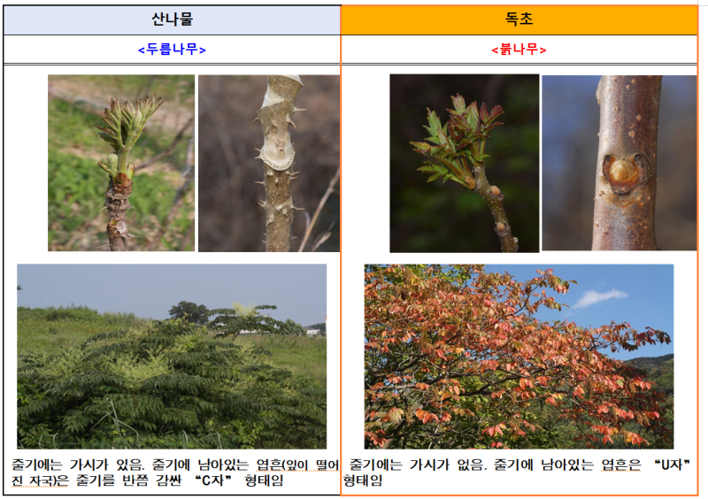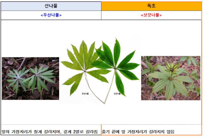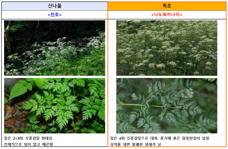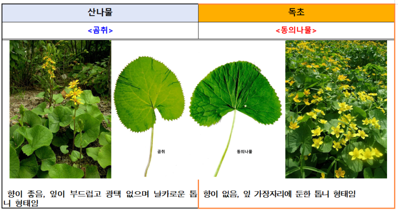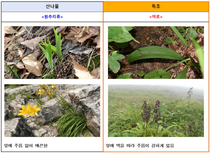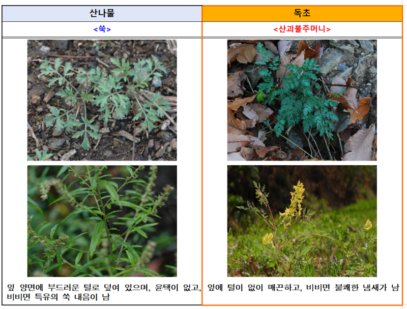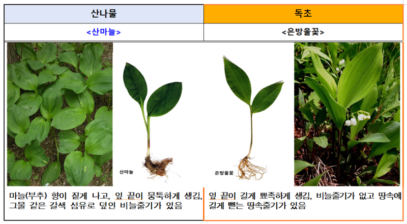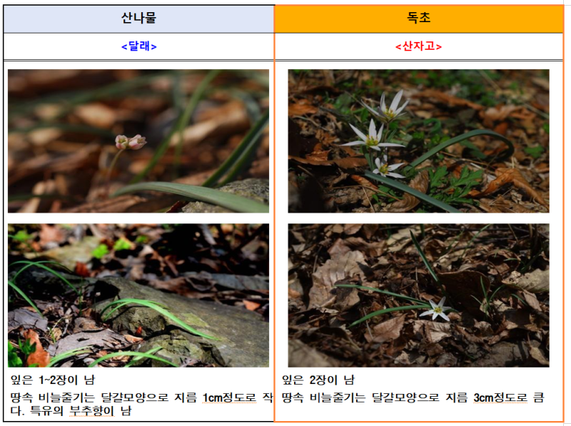 신고 사례가 특히 봄철에 많이 집중되는 이유는 꽃이 피기 전에 잎 또는 뿌리만으로 산나물과 독초를 구별하는 것이 쉽지 않기 때문이며, 주의해야 하는 봄철 독초로는 독미나리, 여로, 붉나무, 산자고 등이 있다.