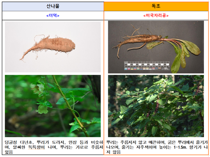 최근 5년간 독초 섭취로 의심되는 신고 사례는 총 94건으로 주로 ▲더덕(미국자리공) , ▲두릅나무(붉나무), ▲미나리(독미나리), ▲원추리(여로)가 신고되고 있고, 전체 신고된 건 중 51%가 봄철인 3~5월에 발생(한국소비자원 소비자위해감시시스템 )한 것으로 확인됐다.