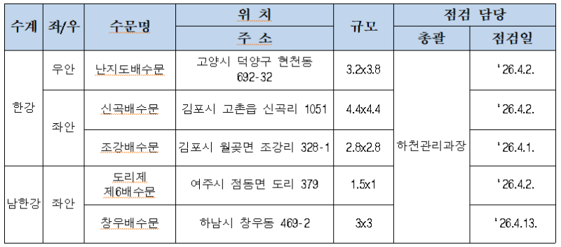 점검 대상은 수도권 하천공사현장과 하천시설물 17개소로, 토공 구간 유실․침하, 교량․배수구조물의 균열 및 침하, 전도 여부 등의 안전관리 실태로, 일부 공사현장은 국토안전관리원과 합동 점검을 하였다.