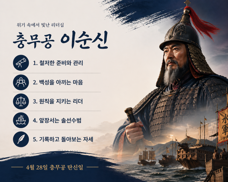 충무공 탄신일이 갖는 의미도 여기에 있다. 과거의 위인을 기리는 데 그치지 않고, 그가 남긴 태도와 원칙을 오늘의 기준으로 다시 읽어내는 일이다. 기록하고, 준비하고, 책임지는 자세는 시대와 환경이 바뀌어도 쉽게 퇴색되지 않는 가치로 남는다.