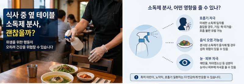 해법은 복잡하지 않다. 음식이 없는 상태에서 정리하거나, 테이블에 직접 분무 대신 타월에 닦는 방식으로 전환하는 것, 최소한 분사 시 주변 손님이 있는지 살피고 손이나 몸으로 가리고 분무하는 등의 방법이다. 이는 법의 문제가 아니라 현장의 배려와 기준의 문제에 가깝다.